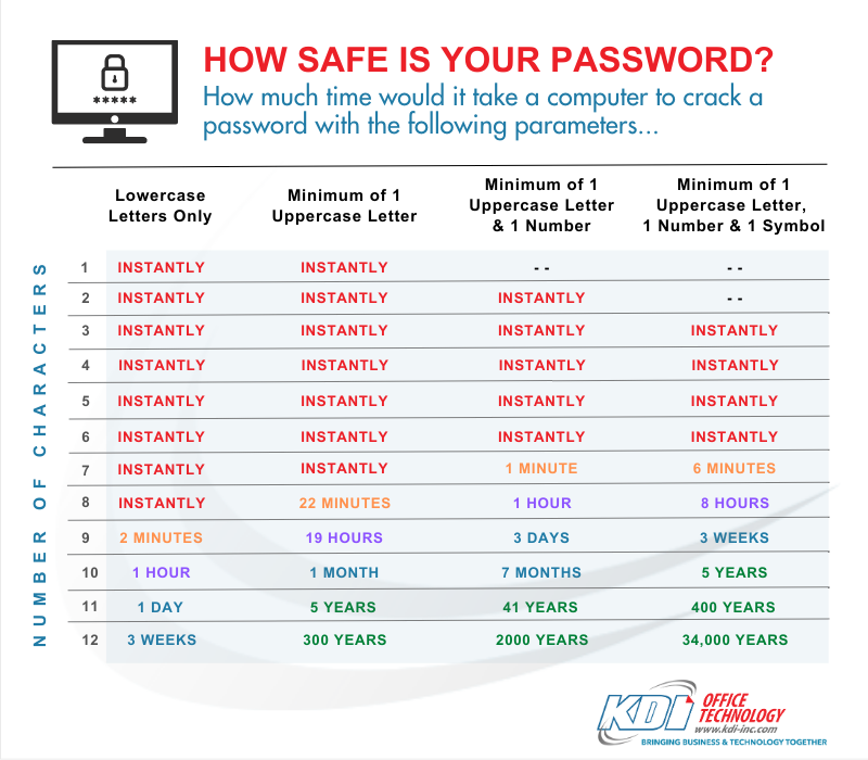 How can we make ourselves less vulnerable? KDI’s NOC (Network Operations Center) recommends the following updated industry standards to strengthen your password to stave off a threat.
